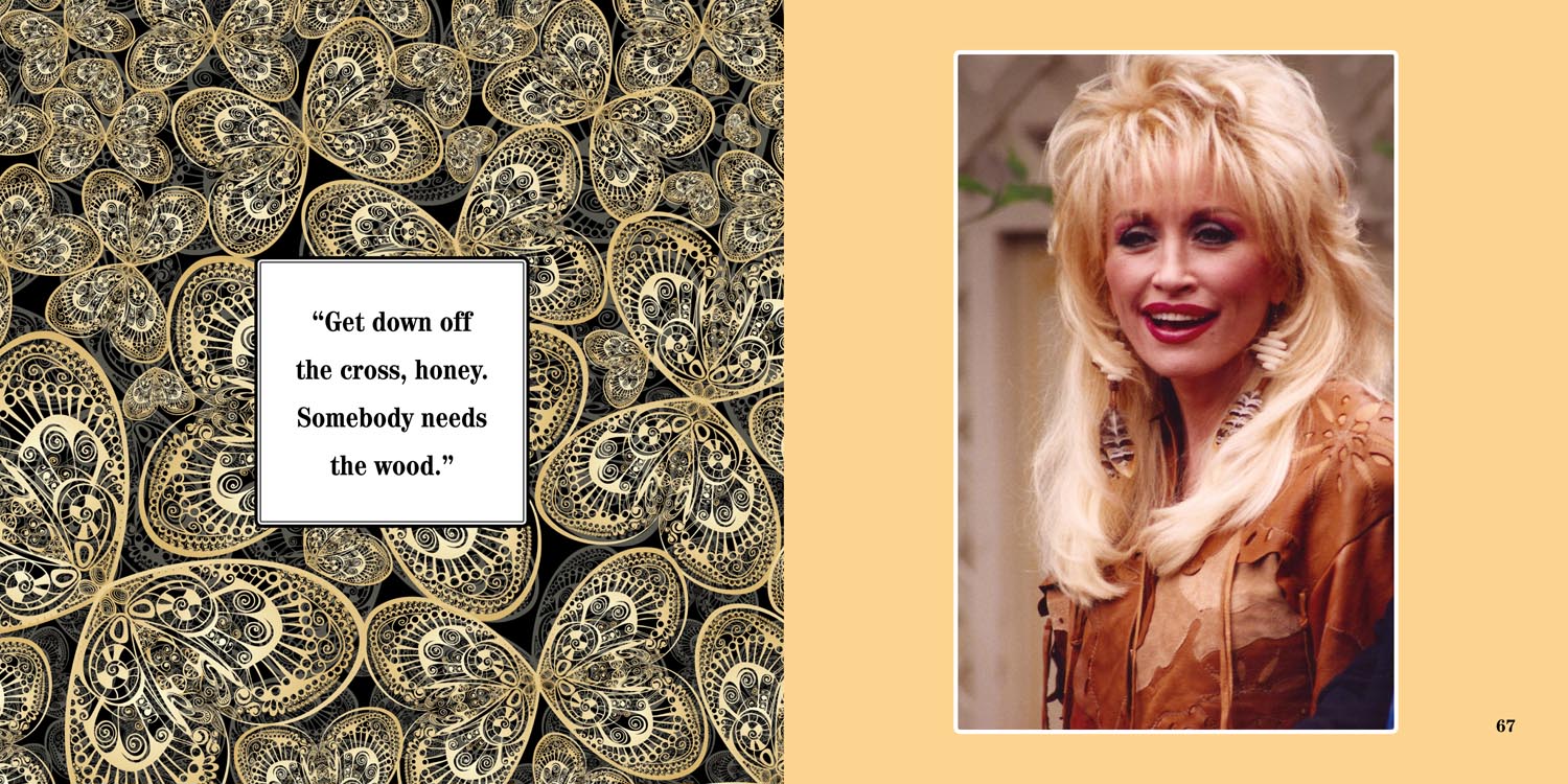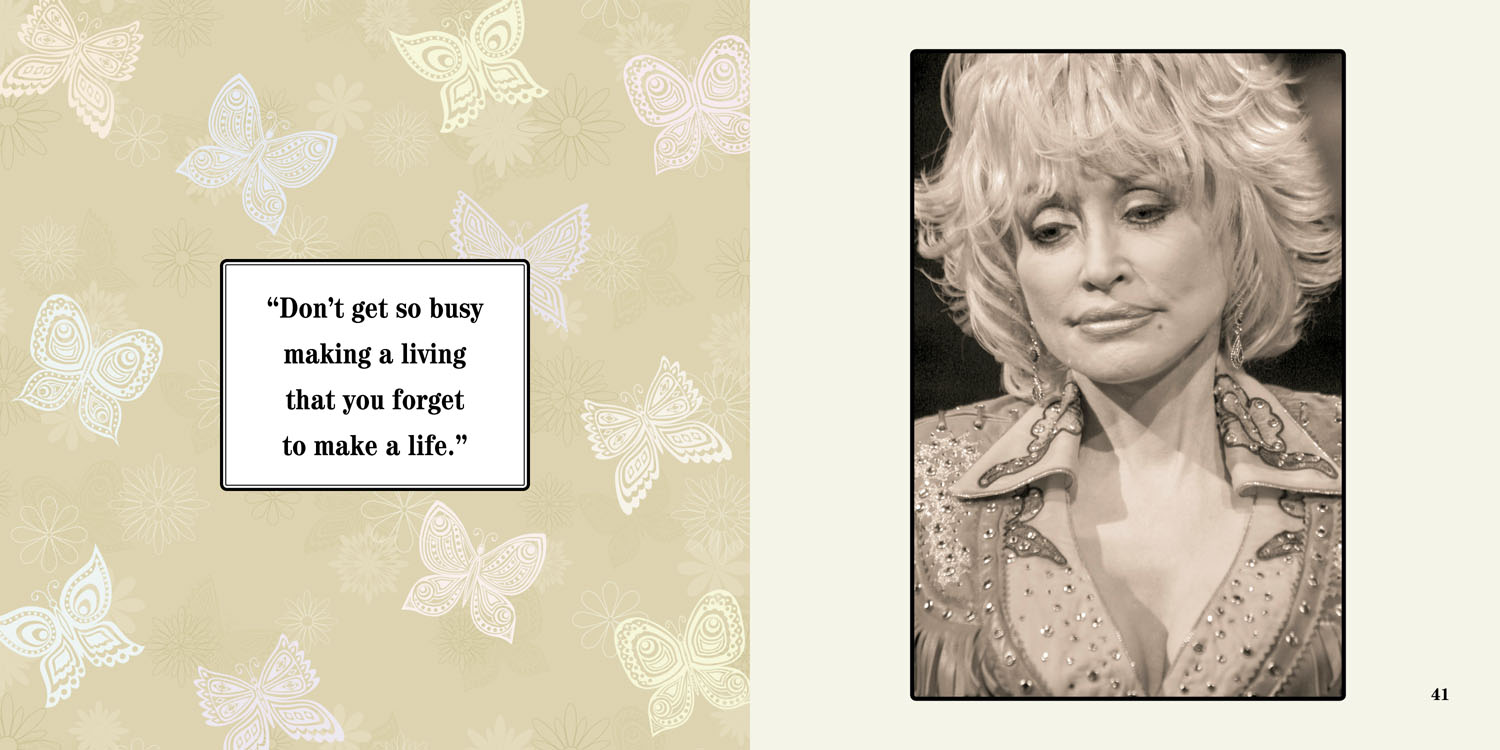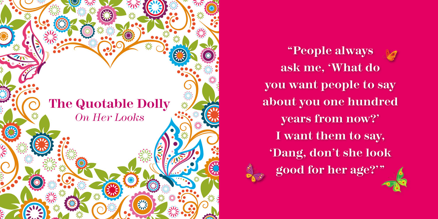That spontaneity—and creative genius—results in the disarmingly funny and wise takes on life and love that punctuate her interviews, stage prattle, and casual conversations. Just as the butterfly, Dolly’s personal totem, acts as an agent of pollination, Dolly’s remarks on her self-image and her rules for living and loving may germinate fertile ideas in you. Or at the very least, summon a smile.