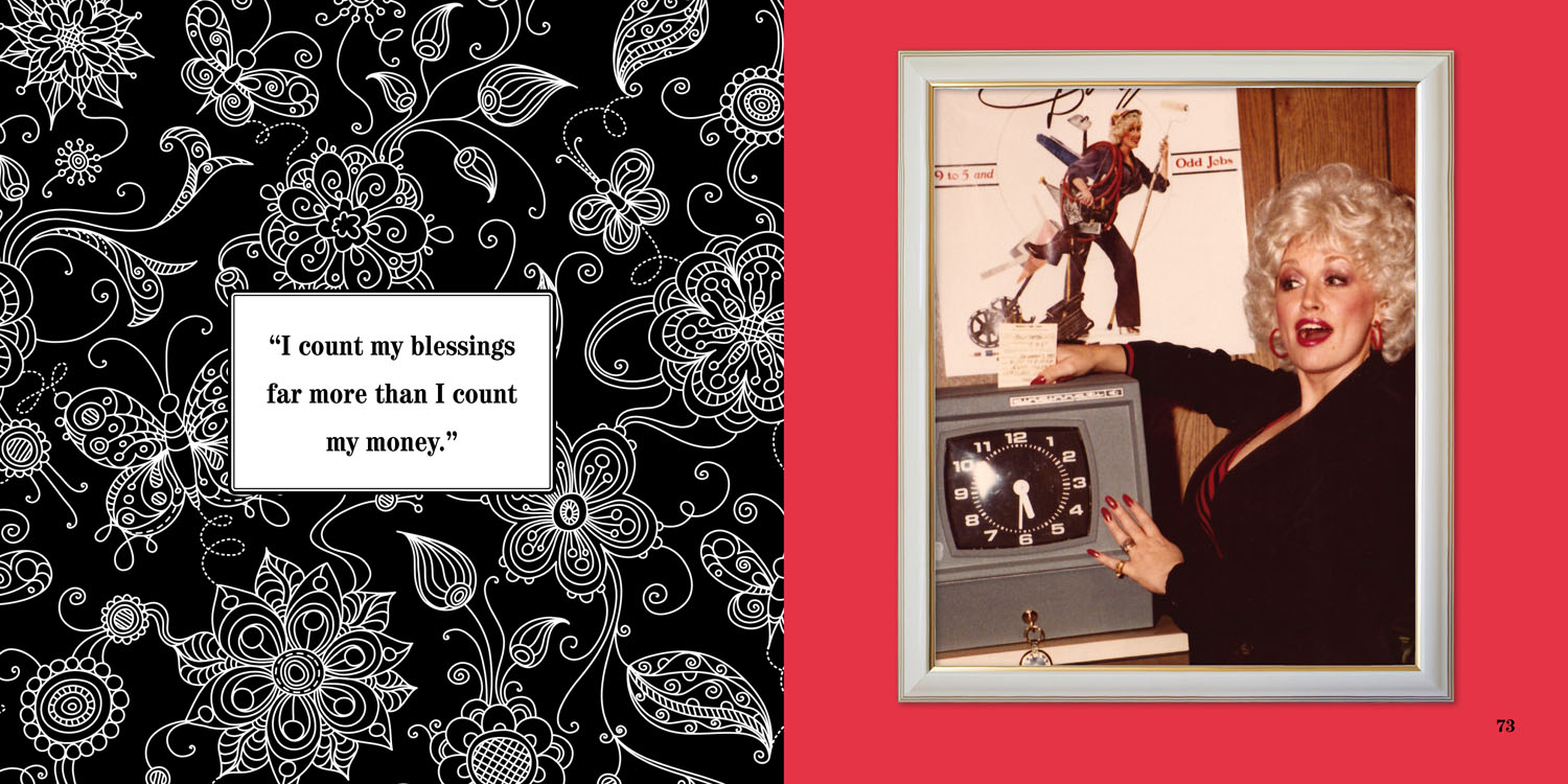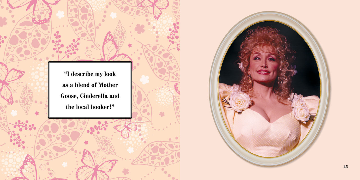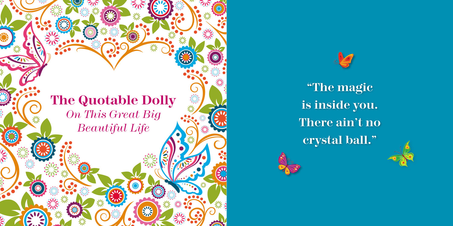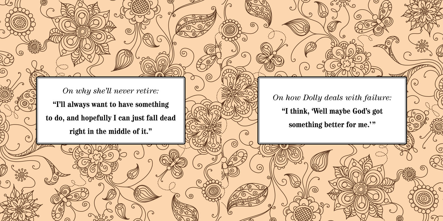 That spontaneity—and creative genius—results in the disarmingly funny and wise takes on life and love that punctuate her interviews, stage prattle, and casual conversations. Just as the butterfly, Dolly’s personal totem, acts as an agent of pollination, Dolly’s remarks on her self-image and her rules for living and loving may germinate fertile ideas in you. Or at the very least, summon a smile.