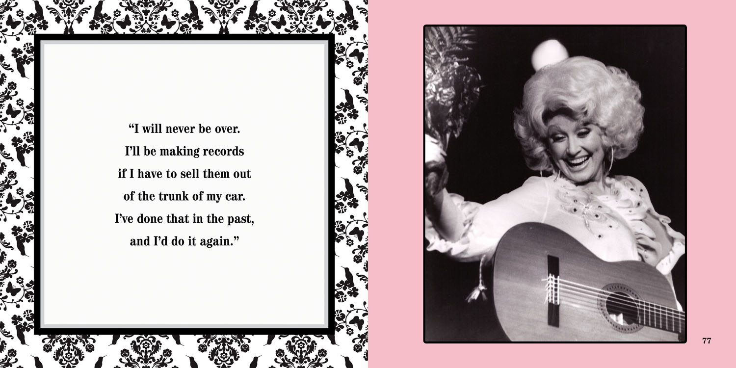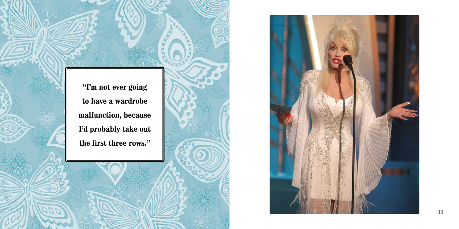 “My husband calls me ‘catfish’—he says I’m all mouth and no brains,” she told former CNN talk show host Larry King in 2003. But as this collection of quips and quotes bears out, Carl Dean, Dolly’s spouse of forty-five years, was just foolin’, and Dolly knows it. “There’s a heart beneath the boobs and a brain beneath the wig,” she says of herself, and insists when she’s inspired, she gets excited, because she can’t wait to see what kinds of ideas she’ll come up with next.